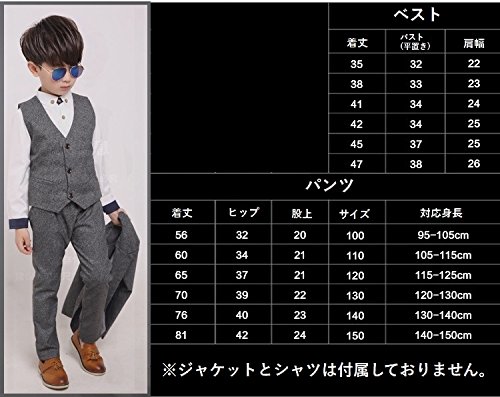 男の子用のベストとパンツ2点セット(サイズについて)画像をご参照ください(素材について)コットン、ポリエステル(補足説明)※ジャケットとシャツは付属しておりません。ジャケット、シャツ付きの4点セットはset-80144をご覧ください