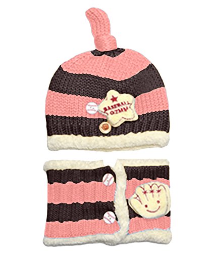 子供用ニット帽+マフラー・ボタン付きネックウォーマー・ニットキャップ・キッズ・ベビー・子ども・男の子・女の子・男女兼用・幼児・Kids F ピンク+ブラウン