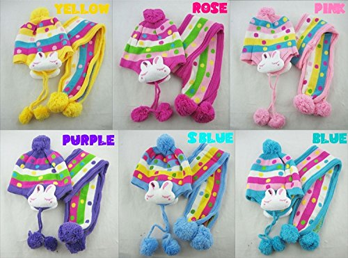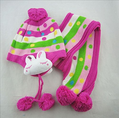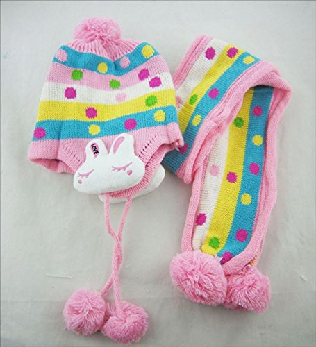 Plus Nao(プラスナオ) 子供用 ニット帽&マフラー 2点セット セットアップ 耳あて付き うさぎ付き ボンボン付き ボーダー バイカラー ベビー キッズ 女の子 男の子 冬帽子 - ローズ