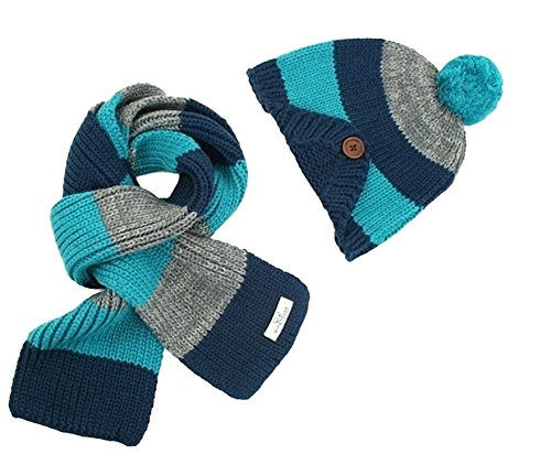 Plus Nao(プラスナオ) 子供用 ニット帽 ボンボン付き ボーダー ボタン付き マフラー付き 2点セット セットアップ ニットキャップ キッズ ジュニア 男の子 女の子 冬帽子 - オレンジ