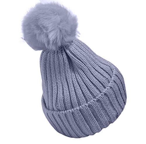 Plus Nao(プラスナオ) 子供用 ニット帽 ファーボンボン付き リブニット ワッチ ビーニー ニットキャップ キッズ ジュニア シンプル 無地 女 - グレー