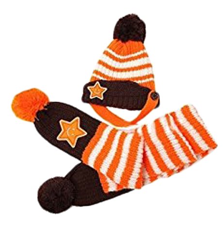 Plus Nao(プラスナオ) 子供用 ニット帽&マフラー 2点セット セットアップ ボンボン付き ボーダー スターワッペン付き ビーニー ベビー キ - オレンジ