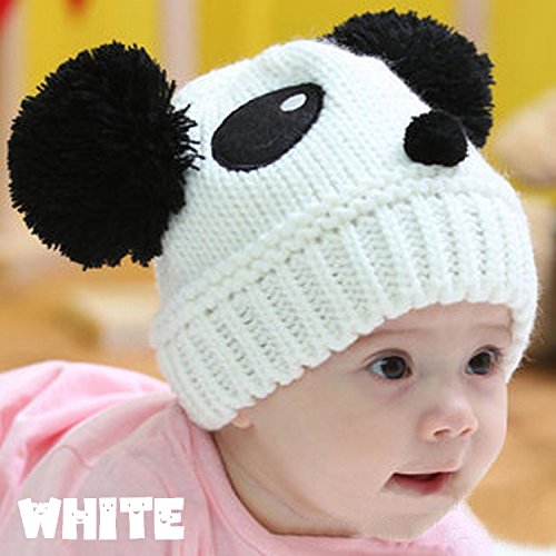 Plus Nao(プラスナオ) 子供用 帽子 ニット帽 ビーニー ニットキャップ パンダデザイン ボンボン付き 赤ちゃん ベビー キッズ 男の子 女の子 冬帽子 バイカラー - ホワイト