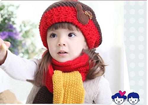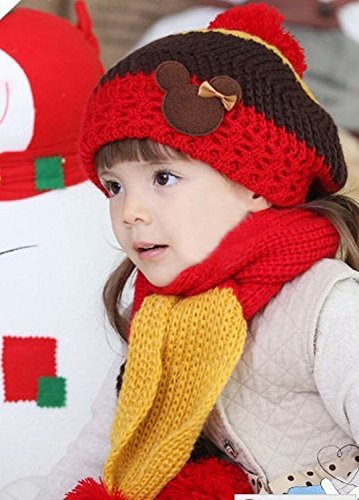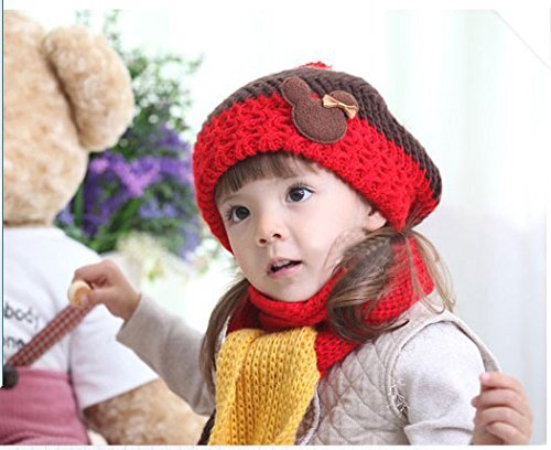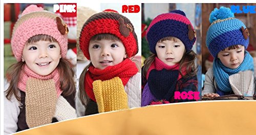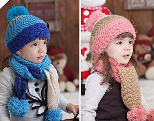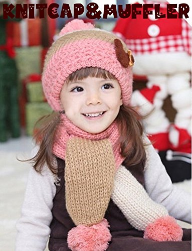 Plus Nao(プラスナオ) 子供用 ニット帽&マフラー 2点セット セットアップ くまさん付き ボンボン付き ボーダー バイカラー ビーニー ベビー キッズ 女の子 男の子 冬帽子 - ピンク