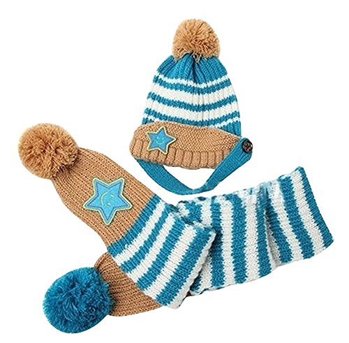 Plus Nao(プラスナオ) 子供用 ニット帽&マフラー 2点セット セットアップ ボンボン付き ボーダー スターワッペン付き ビーニー ベビー キッズ 女の子 男の子 冬帽子 - ブルー
