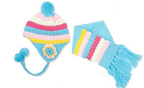 Plus Nao(プラスナオ) 子供用 ニット帽&マフラー 2点セット 耳当て付き ポンポン付き カラフル バイカラー ベビー キッズ 男の子 女の子 帽子 ぼうし あったか 防寒 - ブルー