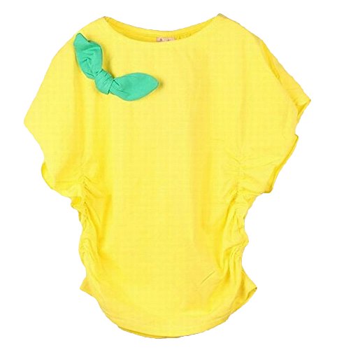Plus Nao(プラスナオ) 子供用 ドルマンカットソー 半袖 カットソー Tシャツ チュニック キッズ 女の子 女児 リボン 無地 ドルマン フレア袖 シャーリング ラウンドネック kids イエロー 130