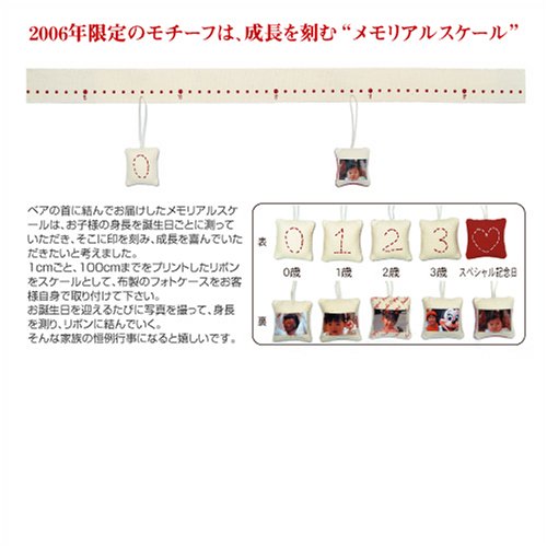 2006年限定モデルは、2006体の数量限定でお仕立て。この年、私たちがメモリアルベアをお届けして10年を迎える区切りの年でした。そこで、お客様が私たちと結ばれてきた感謝とこれからも様々なモノと結ばれる願いを込めて「結ぶ」をコンセプトにベアをデザインしました。その象徴となるモチーフには「メモリアルスケール」を考えました。成長を印し、家族の絆がより結ばれるようにと身長計とフォトケースがセットです。ベアは、鼻の部分をカットせず仕上げてるのでフワフワした印象です。