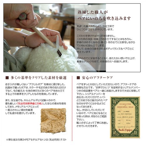 - メモリアルベアをお届けして12年。検査に合格した安全な素材を使用し、自社工房の熟練した職人が丁寧にお仕立てする逸品です。お届け後のお修理などアフターケアも万全でずっと大切にしていただけます。