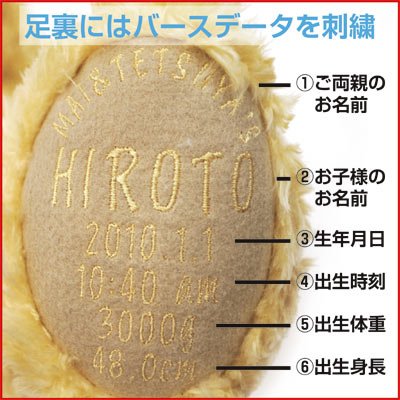 - 左足裏に大切な6つのバースデータ( ●ご両親とお子様のお名前 ●生年月日 ●出生時刻 ●身長 ●体重)が刺繍で刻まれます。
