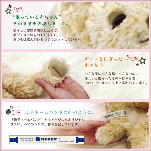 - メモリアルベアは出生時の身長・体重に合わせてお仕立てするオーダーメイドテディベアです。PocheCigogneは、世界で最初に出生時のベアを誕生させたパイオニアです。