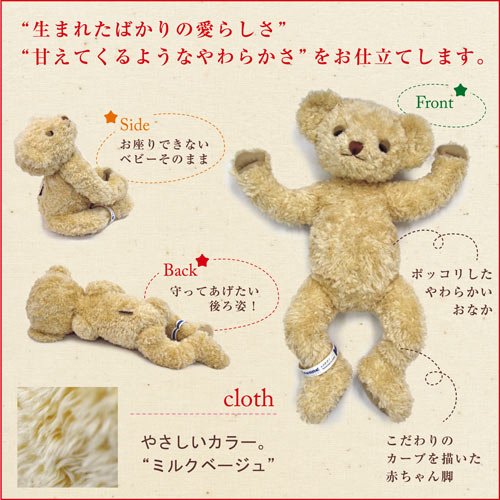 ◆「もっと赤ちゃんらしさを表現したい」その想いをカタチにしたら、今までとはまったく違うメモリアルベアが誕生しました。◆今までのメモリアルベア(ベーシック・限定)との違いは、ズバリ!このやわらかさと表情。だきしめると思わず歓声があがります。◆体はやわらかく、”生まれたての赤ちゃん”のように首もすわっていません。◆抱っこの時も首がすわってなく、やわらかいので、初めて抱いた時の気持ちがよみがえります。◆左の足裏には出生データの刺繍が入ります。 ◆こちらは、お仕立て券でのお届けとなります。 ベアではございませんので、ご注意ください。 ◆記入済みのお仕立て券を返送していただいてからのお仕立てとなります。詳しいお届け日はお仕立て券が弊社に届き次第、ご連絡致します。