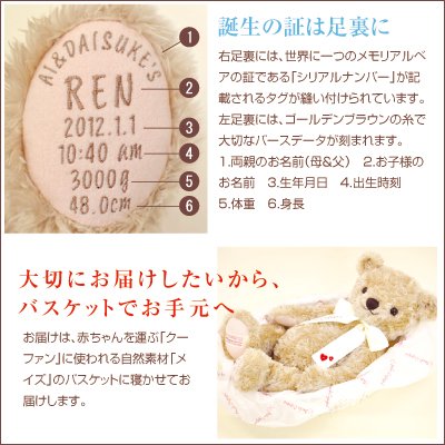 - 大切なバースデータを確実にお客様自身で記入していただける【お仕立て券スタイル】。 ◆ベアのお届け時期は、お仕立て券が弊社に届き次第、ご連絡致します。