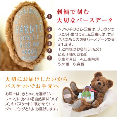 - 大切なバースデータを確実にお客様自身で記入していただける【お仕立て券スタイル】。 ◆ベアのお届け時期は、お仕立て券が弊社に届き次第、ご連絡致します。
