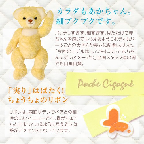 - メモリアルベアは出生時の身長・体重に合わせてお仕立てするオーダーメイドテディベアです。PocheCigogneは、世界で最初に出生時のベアを誕生させたパイオニアです。