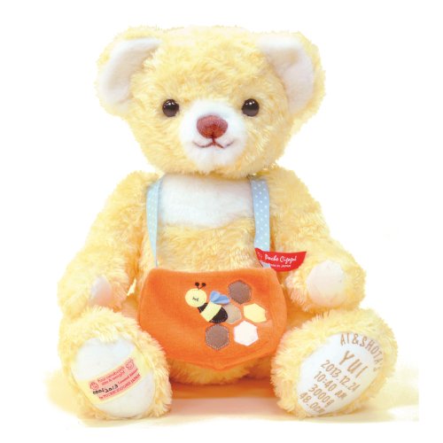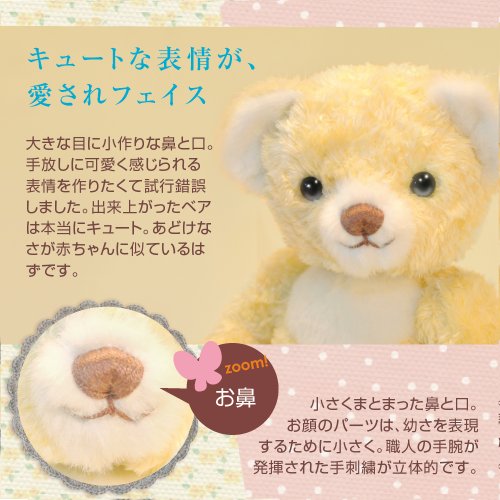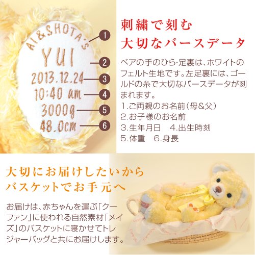 ベアと一緒に大切なものを保管できます。 - 左足裏に大切な6つのバースデータ( ●ご両親とお子様のお名前 ●生年月日 ●出生時刻 ●身長 ●体重)が刺繍で刻まれます。