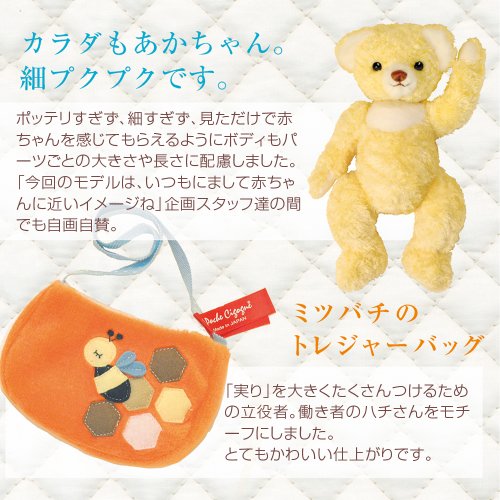 ◆手放しに可愛く感じられるスウィートなベア、2013年限定メモリアルベア秋冬モデル トレジャーバッグ付きです。 幼さを感じさせる小さくまとまった鼻と口。オリジナルカラーの生地はやわらかなイエロー。切替部分のホワイトの組み合わせはスウィート感があふれます。 ◆トレジャーバッグは、働き者のハチさんをモチーフにしました。とてもかわいい仕上がりです。ベアと一緒に大切なものを保管できます。 ◆こちらは、お仕立て券でのお届けとなります。 ベアではございませんので、ご注意ください。 ◆記入済みのお仕立て券を返送していただいてからのお仕立てとなります。詳しいお届け日はお仕立て券が弊社に届き次第、ご連絡致します。