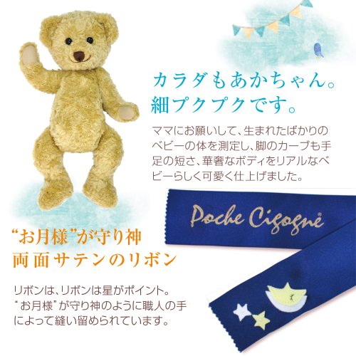 - メモリアルベアは出生時の身長・体重に合わせてお仕立てするオーダーメイドテディベアです。PocheCigogneは、世界で最初に出生時のベアを誕生させたパイオニアです。