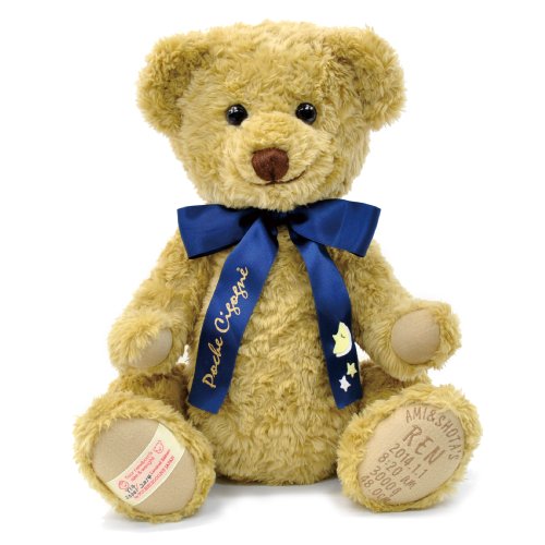 ◆出生時の身長と体重のオーダーメイドティベアです。 「リアルな赤ちゃんらしさ」でハッピーモード全開。夢あるテディベア、2014年限定メモリアルベア トレジャーバッグ付きです。 上品な燻ゴールドのカラー。ベビーのように見る角度で違って見える、さまざまなベアの表情をじっくり確かめてみて下さい。利発そうななかにも愛くるしさを感じる、たくさんの人から愛されるお顔が特徴です。大きな瞳と口角の上がった口元は、見る人の気持ちに応えるような柔らかい表情をしています。ママにお願いして、生まれたばかりのベビーの体を測定し、脚のカーブも手足の短さ、華奢なボディをリアルなベビーらしく可愛く仕上げたテディベアです。 ◆リボンは星がポイントの両面サテン。 “お月様” が守り神のように職人の手によって縫い留められています。 ◆こちらは、お仕立て券でのお届けとなります。 ベアではございませんので、ご注意ください。 ◆記入済みのお仕立て券を返送していただいてからのお仕立てとなります。詳しいお届け日はお仕立て券が弊社に届き次第、ご連絡致します。