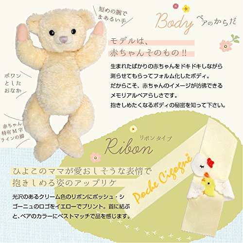 - 光沢のあるクリーム色のリボンにポッシュシゴーニュのロゴをイエローでプリント。首に結ぶと、ベアのカラーにベストマッチで品を感じます。 ひよこのママが愛おしそうな表情で抱きしめる姿のアップリケは職人が手作りでママの愛を表現しています。