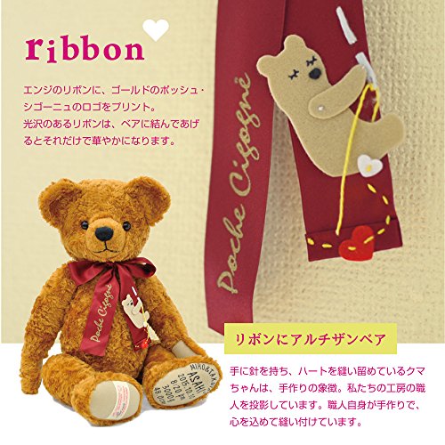 - 光沢あるエンジのリボンに、ゴールドのポッシュ・シゴーニュのロゴをプリント。手に針を持ち、ハートを縫い留めているクマちゃんは、手作りの象徴。私たちの工房の職人を投影しています。 職人自身が手作りで、心を込めて縫い付けています