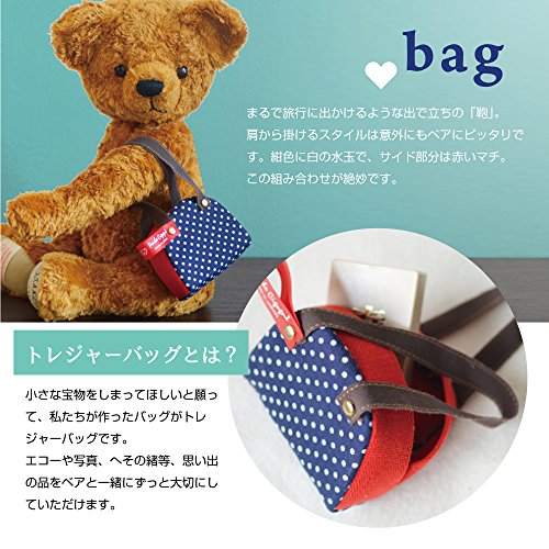 - 小さな宝物をしまってほしいと願って、私たちが作ったバッグがトレジャーバッグです。まるで旅行に出かけるような出で立ちの「鞄」。 肩から掛けるスタイルは意外にもベアにピッタリです。紺色に白の水玉で、サイド部分は赤いマチ。