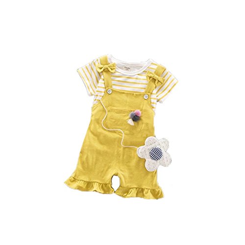 夏カバーオール かわいいストライプTシャツ 女の子の服 Pojour 1-6歳キッズ用 2セット 子供ギフト 綿 通気 黄色(90cm)