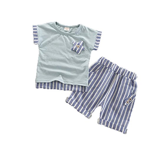 Pojour 夏 1-6歳キッズTシャツ 可愛いシャツ 男女兼用 通気 綿 ストライプTシャツ 上下セット グリーン(110cm)