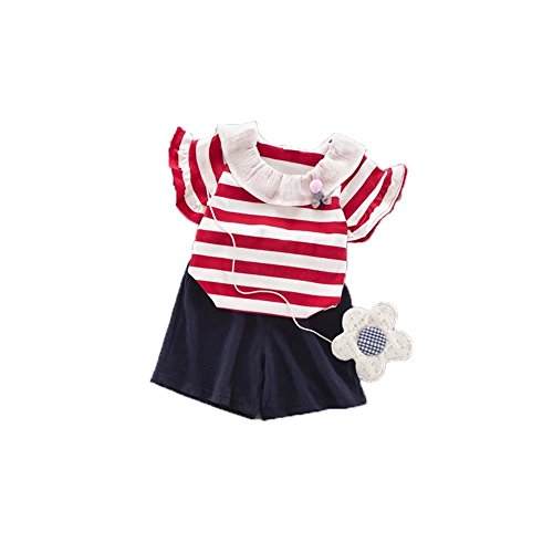 夏ベイビー服 半袖Tシャツ Pojour ガールズTシャツ キッズ用かわいいファッション縦縞Tシャツ 2セット 子供ギフト 綿 通気 90cm 赤
