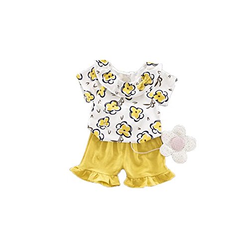 夏Tシャツ+パンツ 上下セット 女の子の服 Pojour 1-6歳キッズ用 子供かわいい花の服 綿 通気 黄色(80cm)