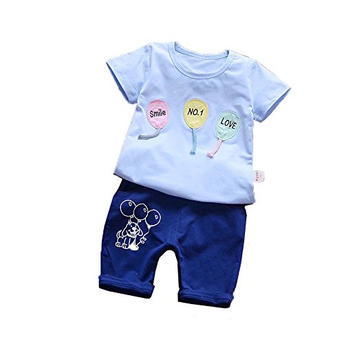 夏Tシャツ+パンツ 女の子の服 男女兼用 2セット Pojour 1-6歳キッズ用 子供かわいいバルーンTシャツ 綿 通気 ブルー(100cm)