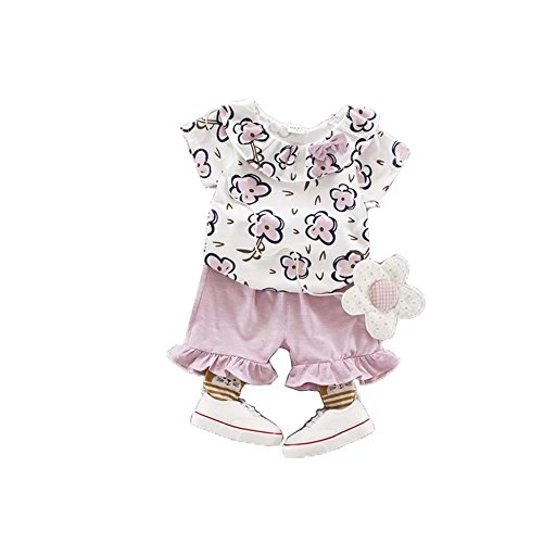 夏Tシャツ+パンツ 上下セット 女の子の服 Pojour 1-6歳キッズ用 子供かわいい花の服 綿 通気 パープル(90cm)
