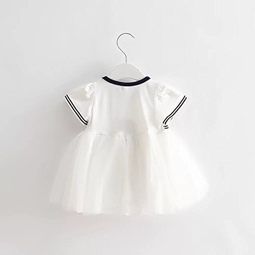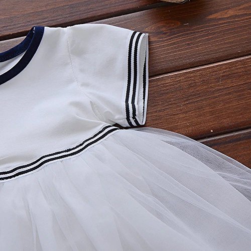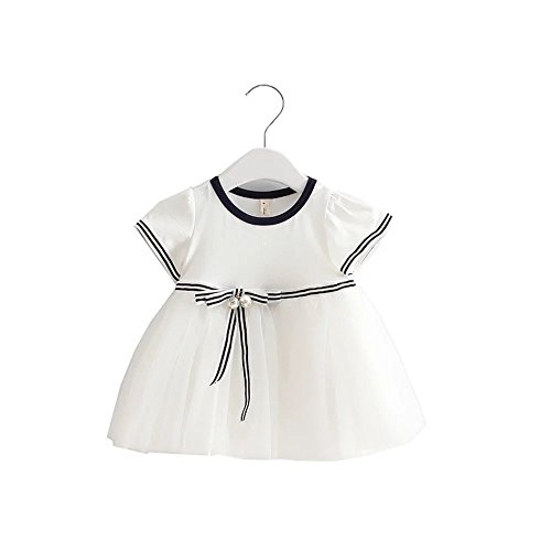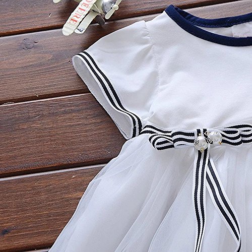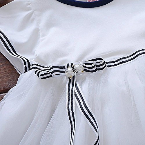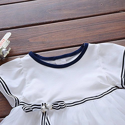 Pojour 夏 1-6歳キッズドレス 子供かわいいチュールワンピース プリンセスドレス 海軍風 綿 リボン付き 白(70cm)