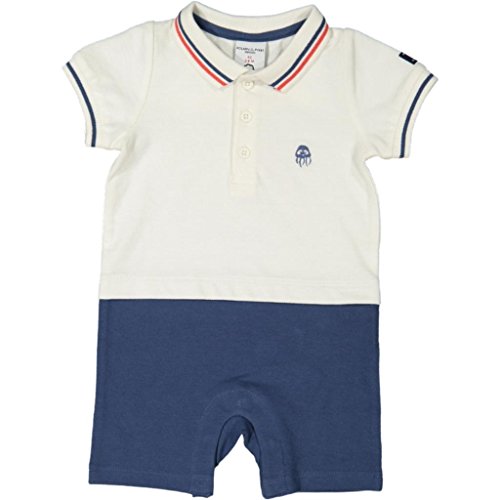 ピケコットンplaysuitのオーガニックコットンの半袖との脚を持つ。polarn O。pyretストライプの袖と襟、刺繍されたタコの胸、です。スナップでおむつ線を作成する簡単に変更されていません。とても柔らかいくりぬいとしないフラットロックシームです。100 %オーガニックコットン