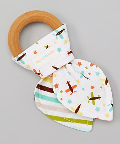 Natural Organic Maple Wooden Teething Ring Toy - Bunny Ears Teether - 100% Airplane & Striped Cotton Front & Back - Great alternative to plastic teether by Polka Dot Moon
