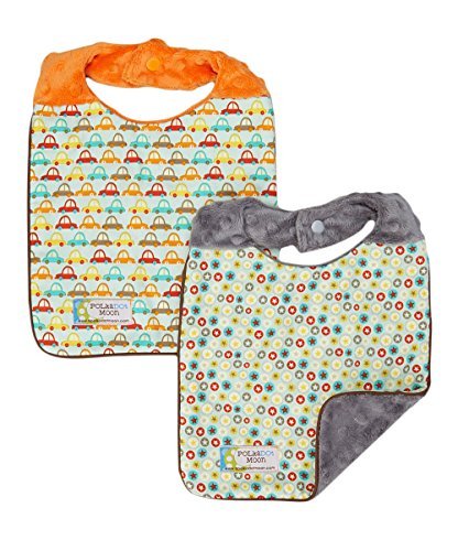 Proudly made in the USA; 100% Cars & Stars cotton print on one side, reverses to super luxe minky on the other;DROOL PROOF - Lined with a layer of flannel for extra absorbency; making this bib stylish and practical;Each Bib is 9 x 13, with a neck opening sized to avoid gaps that expose clothes;SIMPLE snap closure is more practical than Velcro;Unique baby gift, coordinates with Polka Dot Moon burp cloths, binky keepers & blankets