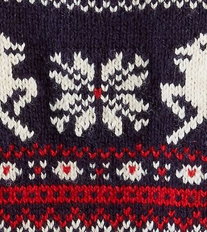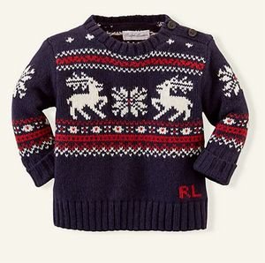 - 長袖、リブのターンバック カフス /左裾に RL の刺繍を施したリブの裾 /全体にインターシャ編みのスノーフレークとトナカイのパターン