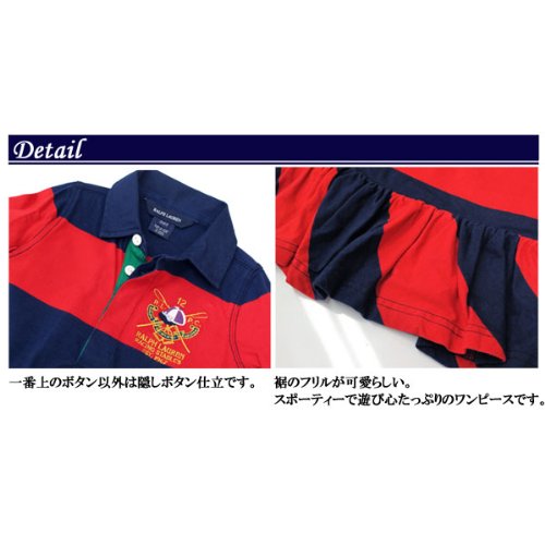 【商品説明】アクティブなラグビースタイルが特徴の可愛いコットンワンピースです。胸元のロゴがアクセントになり、スポーティーさと品の良さを兼ね備えたラルフローレンらしいデザインです。裾のフリルはふわりと可愛らしく、スタッフ一押しアイテムです♪【カラー】レッド×ネイビー【サイズ】【2T・3T・4/4T・5・6・6X】 着丈 46.5・50・53・59・61・64 身幅 26.5・28・29・30.5・31.5・32 肩幅 21・23・23・25・27・27 袖丈 32.5・33.5・36.5・39・42・44 ※平置にして採寸しております。※計測箇所により、ごくまれに若干の誤差があります。ご理解の程、よろしくお願いします。【素材】100%コットン【メール便について】発送から到着まで3-5日程度、日付/時間指定NG、紛失保障なし。代引きでのお買い上げまたは他の商品と同梱の場合は通常発送となります。当店からのメールで送料を修正させていただきます。