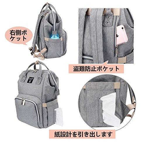 - 【大容量・多機能】:内部弾性収納ポケット、サイドボトルポケット、断熱ボトルポケット、おむつ交換用パッド、などがいっぱいです。後ろジッパーがあり、バッグの底のものを取りやすくて非常に便利です。