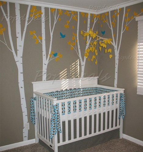 Add a festive life and personality to any space! Instantly decorate and transform any room!. US made matte finish vinyl decal from PopDecals. No clear or white border, it is awesome product that looks hand painted on wall. FREE Squeege and instruction is included for easy application. Size: 4 * 8ft 6inch(260cm)H , Default color: Trunk and birds: White; Leaves: Yellow, Birds: azure blue. Do not use on textured walls (orange, sandy and grainy), fresh paint (less than 14 days) and low VOC (Volatile organic compound) paint.