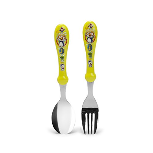 Pororo with Friends Spoon and Fork Set-Children;Stainless Steel with yellow plastic handle;6.5 inches long;Yellow