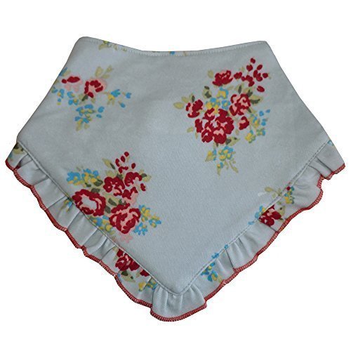 A cute baby girls blue floral design soft jersey bib.;The bib is in a bandana style which is a very trendy design for your little girl, however the bib is in a very traditional blue floral design with a frilly edging which makes the bib look gorgeous and would compliment any babies outfit.;The bib has a velcro fastening at the back and a toweling lining.;Lovely and soft 100% cotton.;Size: One Size