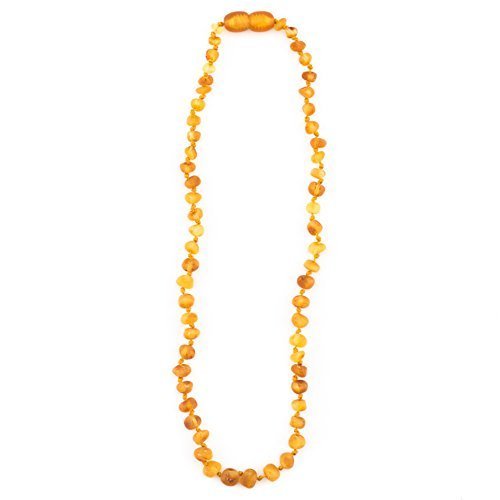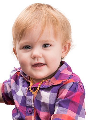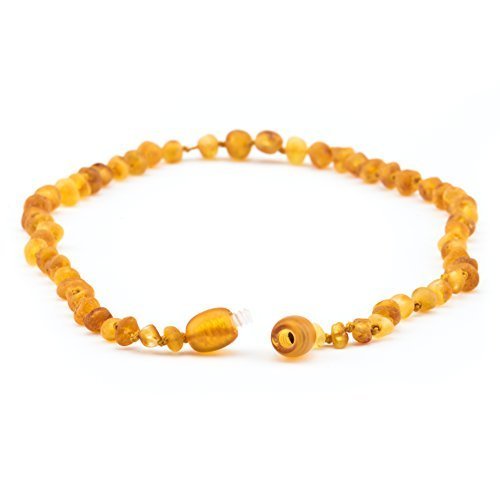SAFE & ORGANIC TEETHING RELIEF - A safe alternative to toxic, chemical teething tablets. Reduces drooling and fussiness. Amber's natural Succinic Acid boosts the immune system and reduces gum swelling.;HIGHEST QUALITY AMBER - Your baby deserves the best. Handcrafted from all natural, authentic Baltic Amber. Each necklace is beautifully polished to perfection by a 100% chemical-free process using small pine pieces in a wooden tumbler. Only necklace verified authentic by the Gemological Institute of America, the world's leading authority in gemology.;WORKS FASTER & LASTS LONGER - Authentic Baltic Amber contains more Succinic acid than imitation opal. Teething pain relief for your baby in 15-30 minutes. Necklace does not lose effectiveness over time.;DURABLE & SAFE DESIGN - Carefully designed for durability and safety. The screw clasp prevents your baby from taking the necklace off. Every bead is secured by two knots. This prevents a choking hazard. 3 sizes to choose from: pick the best length for your infant or toddler's neck.;UNMATCHED GUARANTEE - 100% satisfaction guaranteed for LIFE. If after 7 days of wearing our amber necklace your baby is not drooling or fussing noticeably less, please send the necklace back (the bonus pendant is yours to keep). Not only will we completely refund your money, but we will then buy you any other baby amber necklace on Amazon. Also, for a limited time, you will receive a free silicone teething necklace with your purchase (a $15 value!)
