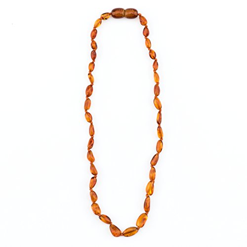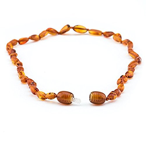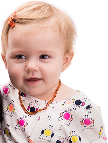 SAFE & ORGANIC TEETHING RELIEF - A safe alternative to toxic, chemical teething tablets. Reduces drooling and fussiness. Amber's natural Succinic Acid boosts the immune system and reduces gum swelling.;HIGHEST QUALITY AMBER - Your baby deserves the best. Handcrafted from all natural, authentic Baltic Amber. Each necklace is beautifully polished to perfection by a 100% chemical-free process using small pine pieces in a wooden tumbler. Only necklace verified authentic by the Gemological Institute of America, the world's leading authority in gemology.;WORKS FASTER & LASTS LONGER - Authentic Baltic Amber contains more Succinic acid than imitation opal. Teething pain relief for your baby in 15-30 minutes. Necklace does not lose effectiveness over time.;DURABLE & SAFE DESIGN - Carefully designed for durability and safety. The screw clasp prevents your baby from taking the necklace off. Every bead is secured by two knots. This prevents a choking hazard. 3 sizes to choose from: pick the best length for your infant or toddler's neck.;UNMATCHED GUARANTEE - 100% satisfaction guaranteed for LIFE. If after 7 days of wearing our amber necklace your baby is not drooling or fussing noticeably less, please send the necklace back (the bonus pendant is yours to keep). Not only will we completely refund your money, but we will then buy you any other baby amber necklace on Amazon. Also, for a limited time, you will receive a free silicone teething necklace with your purchase (a $15 value!)