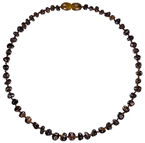 SAFE & ORGANIC TEETHING RELIEF - A safe alternative to toxic, chemical teething tablets. Reduces drooling and fussiness. Amber's natural Succinic Acid boosts the immune system and reduces gum swelling.;HIGHEST QUALITY AMBER - Your baby deserves the best. Handcrafted from all natural, authentic Baltic Amber. Each necklace is beautifully polished to perfection by a 100% chemical-free process using small pine pieces in a wooden tumbler. Only necklace verified authentic by the Gemological Institute of America, the world's leading authority in gemology.;WORKS FASTER & LASTS LONGER - Authentic Baltic Amber contains more Succinic acid than imitation opal. Teething pain relief for your baby in 15-30 minutes. Necklace does not lose effectiveness over time.;DURABLE & SAFE DESIGN - Carefully designed for durability and safety. The screw clasp prevents your baby from taking the necklace off. Every bead is secured by two knots. This prevents a choking hazard. 3 sizes to choose from: pick the best length for your infant or toddler's neck.;UNMATCHED GUARANTEE - 100% satisfaction guaranteed for LIFE. If after 7 days of wearing our amber necklace your baby is not drooling or fussing noticeably less, please send the necklace back (the bonus pendant is yours to keep). Not only will we completely refund your money, but we will then buy you any other baby amber necklace on Amazon. Also, for a limited time, you will receive a free silicone teething necklace with your purchase (a $15 value!)