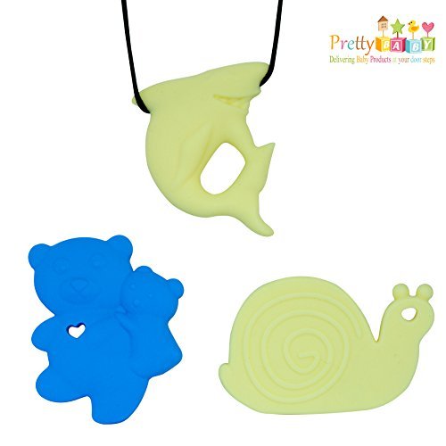 PAIN RELIEF FOR TEETHING BABY - The Teethers offers instant teething pain relief & massage gums of your baby. Chewy and soft teether offers natural and healthy pain relief while saving your baby from dangerous side effects of Drugs.;THREE PIECE PACKAGING WITH FREE TEETHING NECKLACE: Our Gift Pack ready Baby Teether comes with Two Soft Chewy Baby Teethers and one Baby Teething Necklace in Shark Shape.;EDUCATIONAL AND COLORFUL - This Silicone teether comes in different shapes and colors that can easily attract babies. This is an essential way to develop their motor skills.;100% BPA FREE & EASY TO CLEAN - The teething toys are primarily made from food grade silicone which is considered to be BPA free. It is also FDA approved, latex free, PVC free, lead free silicone and rubber free. This is a best baby teether that is easy and simple to be cleaned.;ORDER NOW AND CHECK OUR ENTIRE PRODUCT LINE - Type Pretty Baby Products in Search Bar and Browse our entire line of Baby Products. 30 Days Money Back GUARANTEE. Limited Time Pricing.