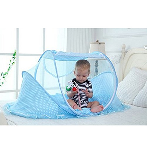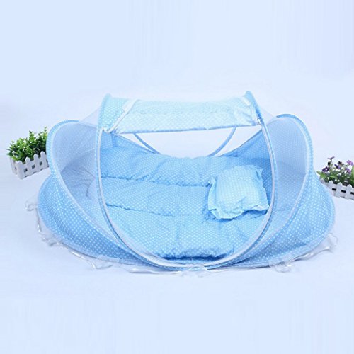 Prettyia 折り畳み式 携帯型 ワンタッチ 蚊よけ 防塵 ベビーベッド テント 蚊帳 マットレス 枕 2色選べ - ブルー