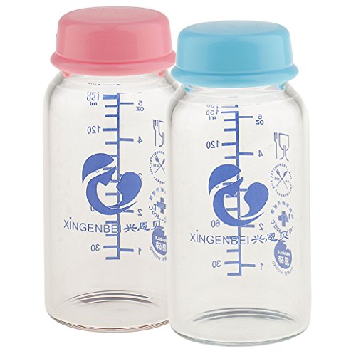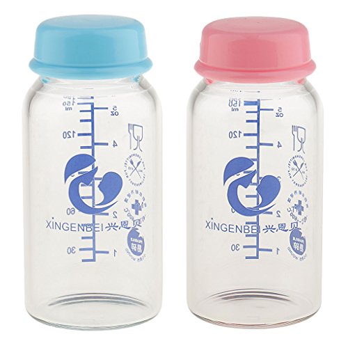 Prettyia 2個 ベビー ガラス 母乳保存ボトル 哺乳瓶 ボトル ふた付 150ml - ピンクとブルー