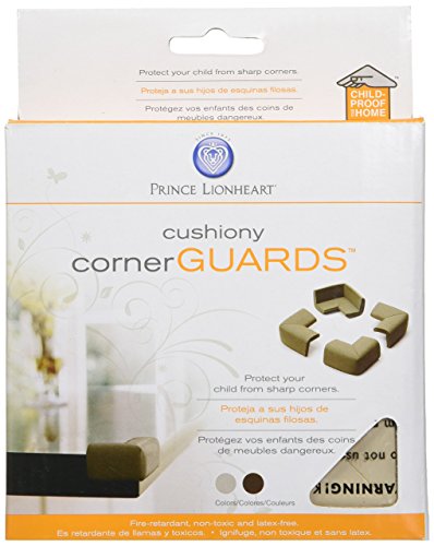 Removes quickly and easily when no longer needed. Protect your child against the bumps, bruises, and boo-boos they can get while exploring the world around them. Prince Lionheart's cushiony corner guards are 2" x 2" and secure easily to sharp corners. The corner guards absorb impact and lessen the chance of falls causing serious injury to young children. Fire retardant, non-toxic and latex-free. Available in chocolate and grey.