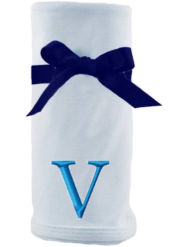Princess Linens Embroidered Blue Initial Cotton Knit Blanket, V by Princess Linens